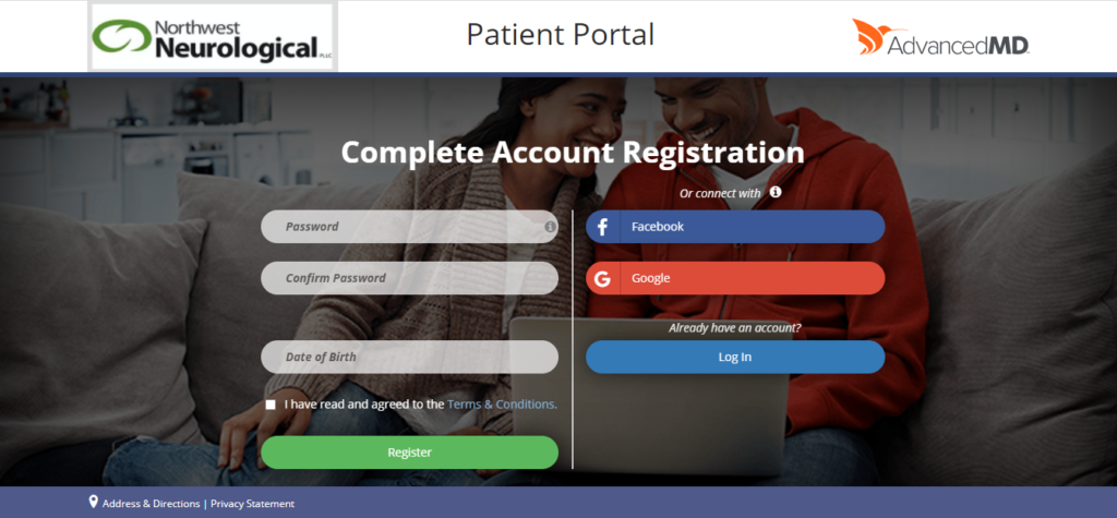 Please click on the button “Patient Portal” below. This will open the webpage to the right. Please create a “Password”, “Confirm Password” and enter your “Date of Birth”. Select the box “I have read and agreed to the Terms and Conditions”. Next, click on the green “Register” button.