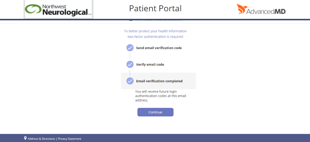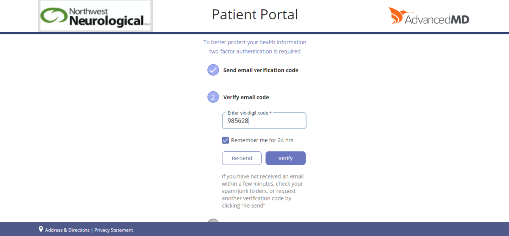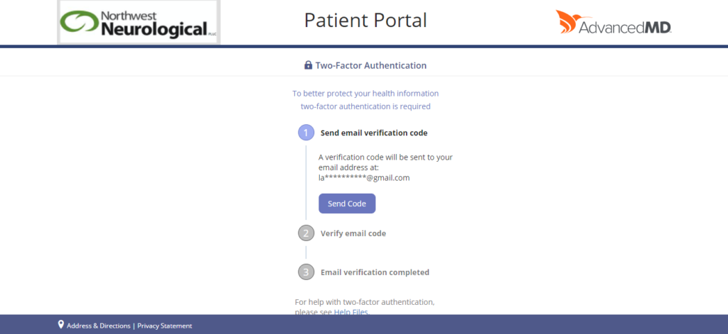 This will take you to the Two-Factor Authentication page. Please select “Send Code”. This will send a verification code to your e-mail address you provided Northwest Neurological when you first became a patient.